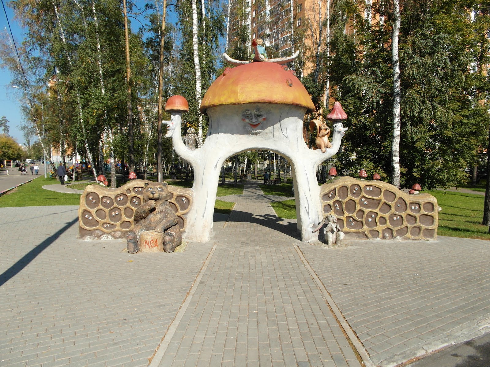 16. Вход на аллеи оформлен в виде большого гриба. Ок.